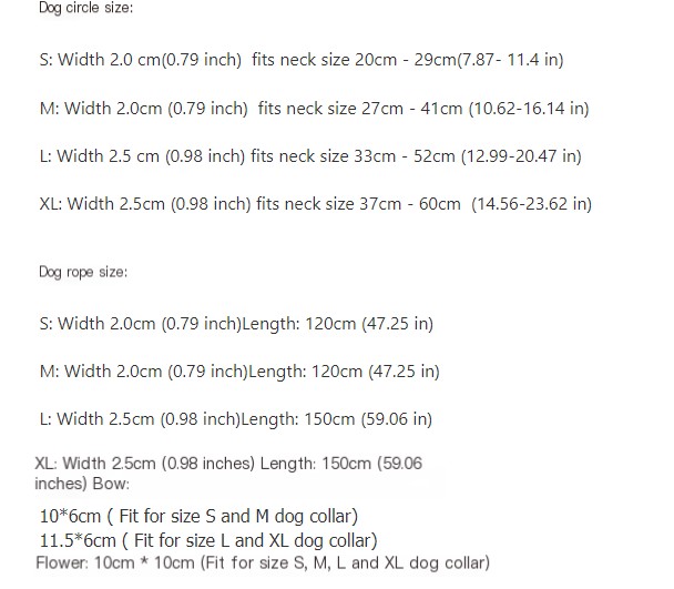 The collar's width varies from 2.0 cm (0.79 inches) for smaller sizes to 2.5 cm (0.98 inches) for larger sizes, accommodating neck sizes from 20 cm to 60 cm (7.87 to 23.62 inches). The leashes match in style and are available in lengths up to 150 cm (59.06 inches).